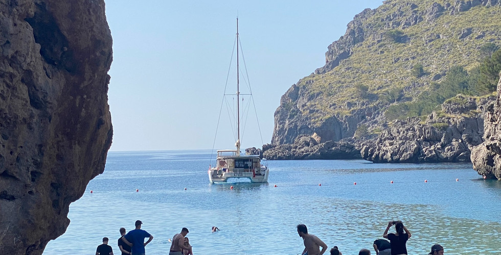 As the boats around us started to grow we decided it was better to be onboard with a fender in hand than be on the beach. We headed back just in time to see a day tripper boat drift back into the catamaran next to us. Some of these day tripper boats were huge, much bigger than us, and just kept on coming. We sat on the trampoline, G&T in hand watching it all unfold around us. Whilst several were very close indeed, we consoled ourselves that by 5pm they would all have left which was the case. However at 6pm a charter boat anchored quite close next to us. We politely asked whether they were staying the night and after he confirmed it we told him he was a bit close. Thankfully he agreed to move. After 7pm we felt comfortable enough to head to the beach for a cocktail. Start of May in Mallorca - we started to worry what the rest of the place would be like, let alone what July and August would be like elsewhere!