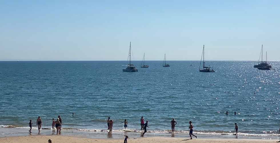 The first night we ate on board to confirm all was good with the anchor. The next day we took the dinghy across to the fuel pontoon at the marina and tied up on the end. It was a beautiful hot sunny day. We walked around the bay and went for a drink in a little bar. People were sunbathing on the beach and as we looked out over the water in front of us, there was Rockhopper, bobbing about in the bay. This was what we had been waiting for. Sitting on a beach looking out at our boat. It was a lovely moment for us. After a walk round the town we went back to the boat for a few hours. There is quite an active sailing club in Cascais and they seemed to use our boat as a marker. We sat on deck watching as they came within arms length round the stern, trying to get the shortest line. We make quite a bit of a wind blocker so some did not fair so well coming that close!
