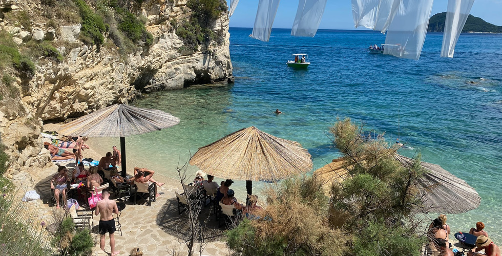 The following morning we yanked the anchor out of the sand and motored the 1.34nm to Agios Sostis, anchoring in 4m of water, just off Cameo Island and round the corner from Laganas, a long stretch of beach with restaurants and bars along it. We had been warned that the anchorage was crazy busy with tour boats buzzing by towards Cameo Island, but we were in search of a bit of life. That life didn’t need to fly by within 5 metres of the boat causing a huge wake to rock the boat but then we had been warned. With swimming off the back of the boat off the cards, we launched the dinghy and took her round to Agios Sostis harbour where we hoped we could tie her up and go for a wander. We found a spot in amongst some fishing boats and took the small bridge over to Cameo Island, along with about 20 other people. The island itself was shaped a bit like a horseshoe with a small gravelly beach on the inside. There was supposedly a bar and restaurant on the island and they had strung up a set of white banners or sheets between the two ends of the beach. All good for a selfie shot. Once you crossed the bridge there were some stairs up to a small booth with a person letting us know that there was a €5 per person entrance fee and that we would get a free photo keyring with this payment. We had read some reviews of the place and figured we would be there for a while having a few drinks so we handed over the money, had our picture taken and wandered through. Well, it would have been nice if they guy had told us that nothing was open. No restaurant, no bar, nothing. We took some photos at the top, walked down to the beach which had about 35 people crammed on to it, sat on a chair and looked at the white sheets blowing in the breeze. After about 20mins of this, we stood up, walked back up the stairs, collected our crappy key ring with a fuzzy photo of us in it and crossed back over the bridge. Not the experience we had hoped for but you win some you lose some. We walked back to the dinghy and decided to move it round to Laganas beach. By this point Carl and I were hankering for a drink and something to eat. We found a small stretch of sand that we could haul the dinghy up onto and tie off and then wandered down the beach front picking out a good spot for a cocktail. Now this was more like it! Well touristy but hey, we’d been stuck on the boat for three days, we’d take it.