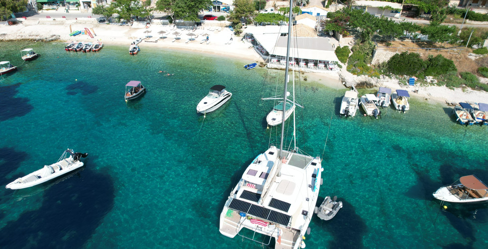The following morning as we fretted about how to drop our stern mooring line, not get it wrapped round a prop and not swing into the boats to our side, thankfully the boat directly to our port side and the one behind us left. This gave us more room and just the mooring lines to worry about. As usual, all the fretting was for nought and Carl spun her round and we left the bay without issue. There was no real wind to speak of so we motored the 14nm to the south side of Kefalonia. We dropped the hook in 5m of sand along a lovely beach but really this was just a pitstop on our way to Argostoli. We had dinner on board and called it a night.